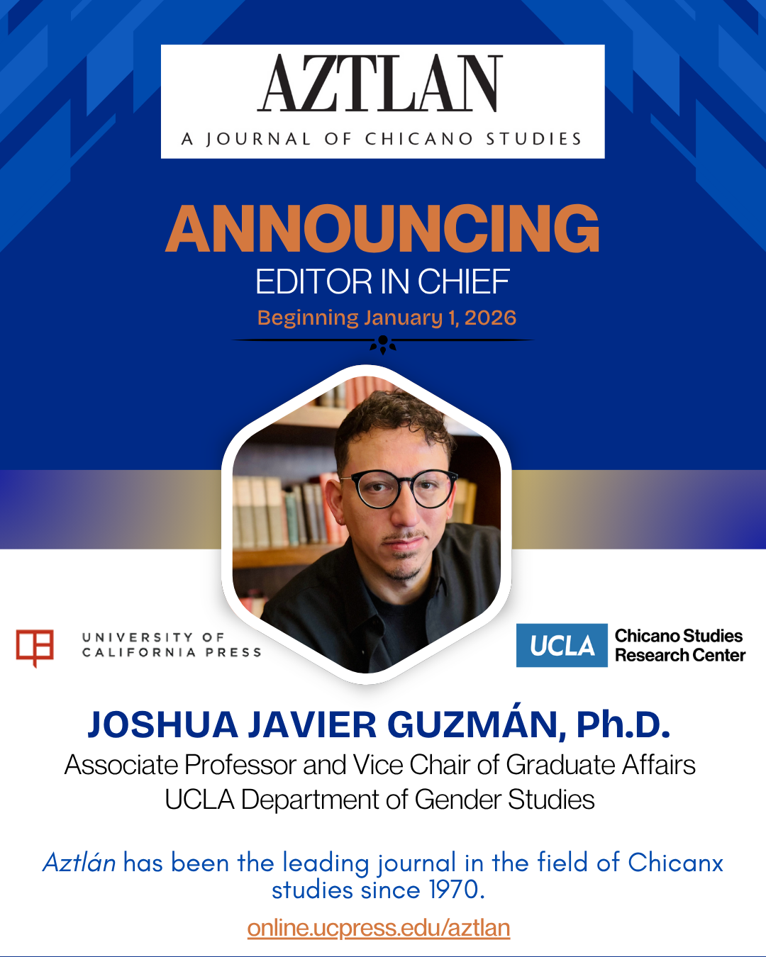 Guzmán, associate professor and vice chair of graduate affairs in the UCLA Department of Gender Studies, will begin his term January 1, 2026, succeeding current editor Charlene Villaseñor Black.
