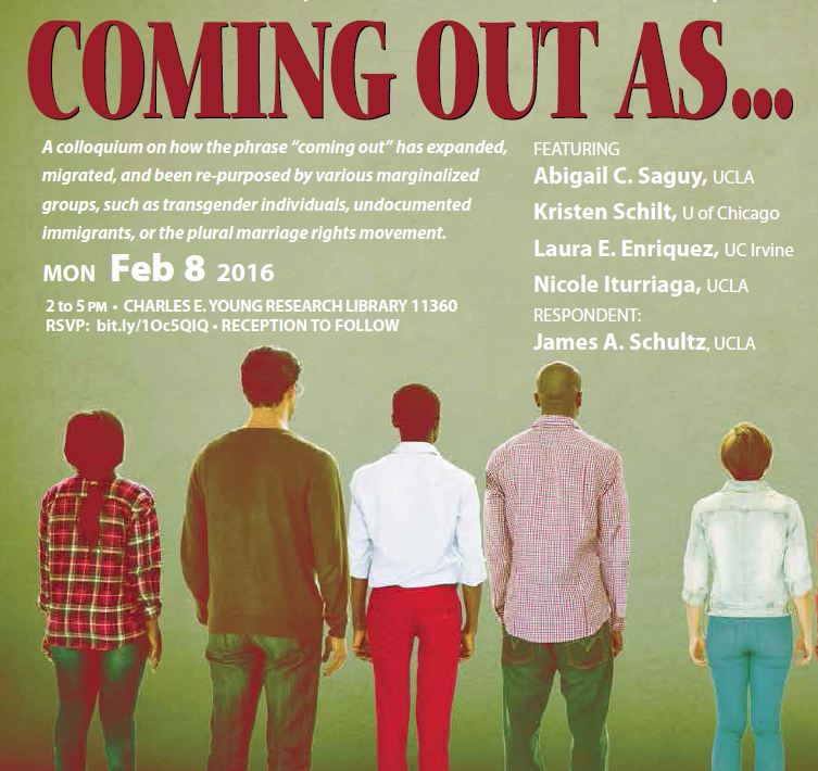 A colloquium on how the phrase “coming out” has expanded, migrated, and been re-purposed by various marginalized groups, such as transgender individuals, undocumented immigrants, or the plural marriage rights movement.
