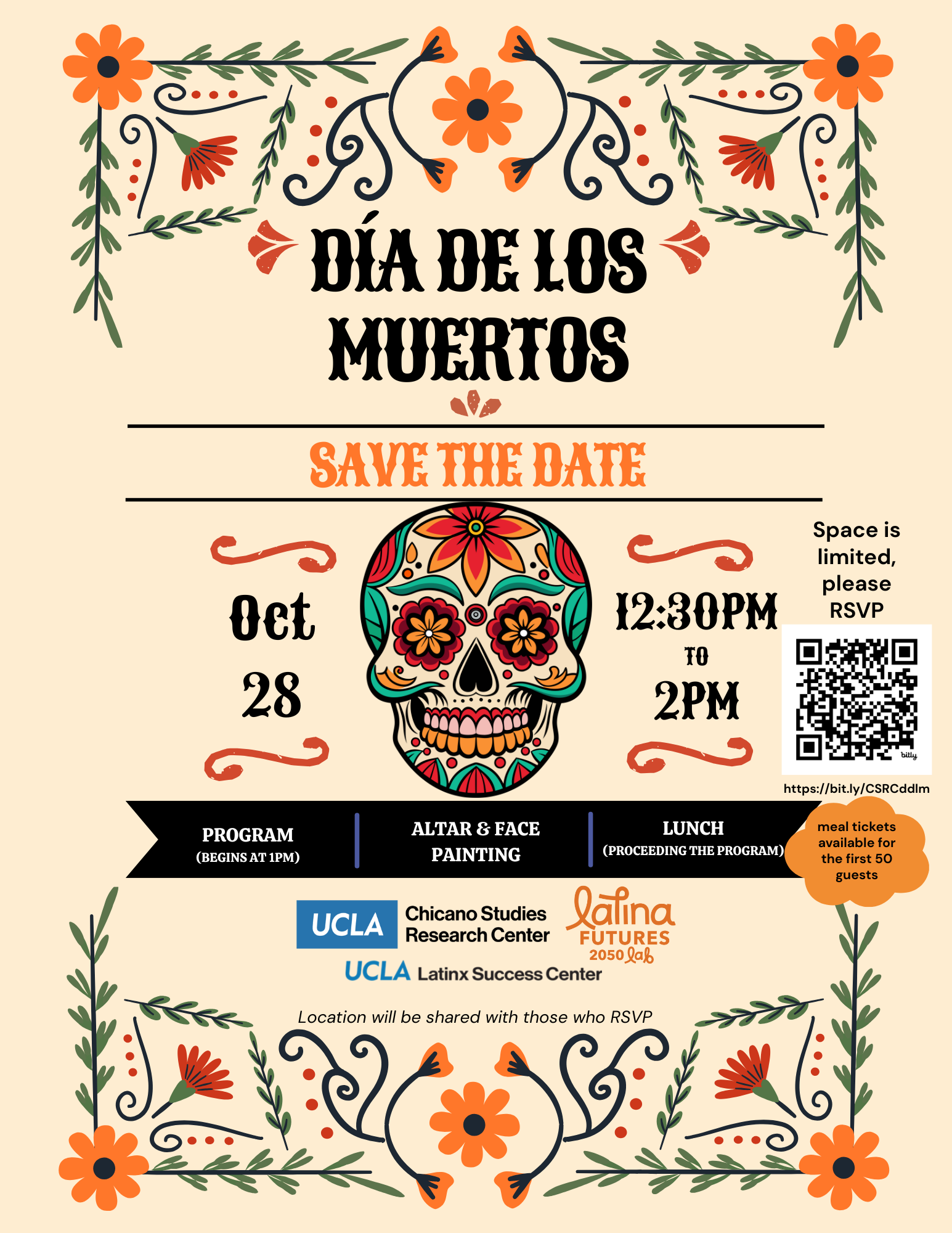 Please join the CSRC, Latina Futures 2050 Lab, and the UCLA Latinx Success Center for a Día de los Muertos celebration at UCLA, including face painting, and altar, and guest speakers.