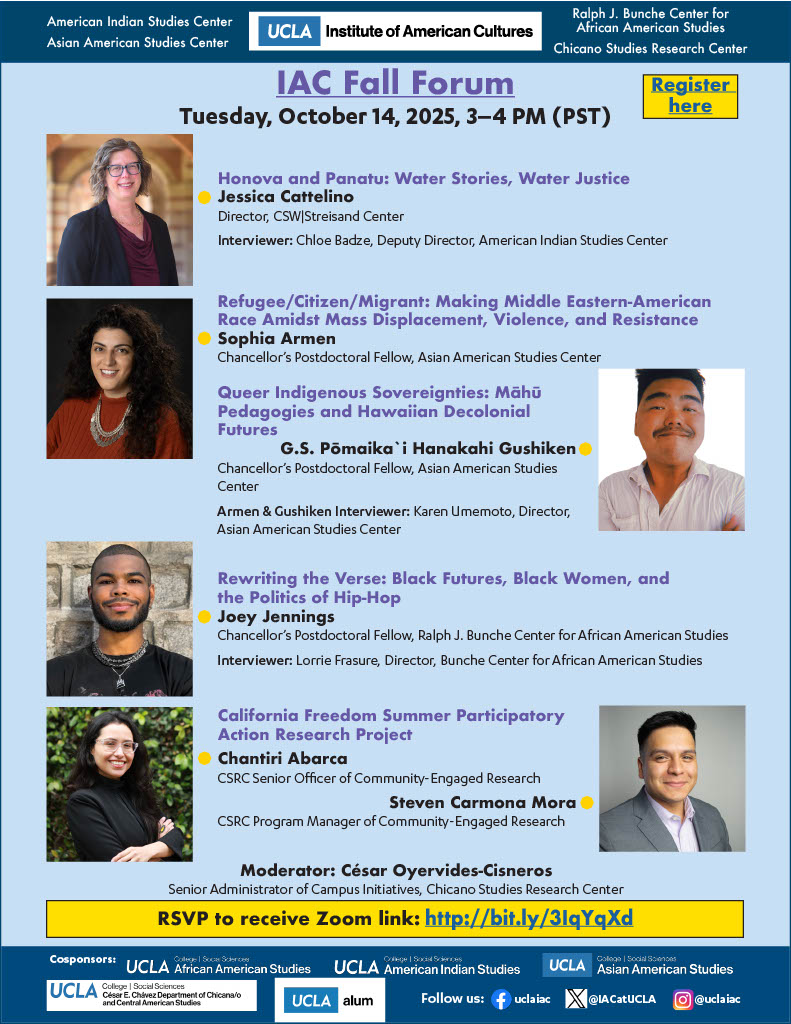 You are invited to the UCLA Institute of American Cultures (IAC) annual Fall Forum, featuring 2025–26 postdoctoral scholars and center representatives from UCLA’s four ethnic studies research centers. This online event will feature a live Q&A.