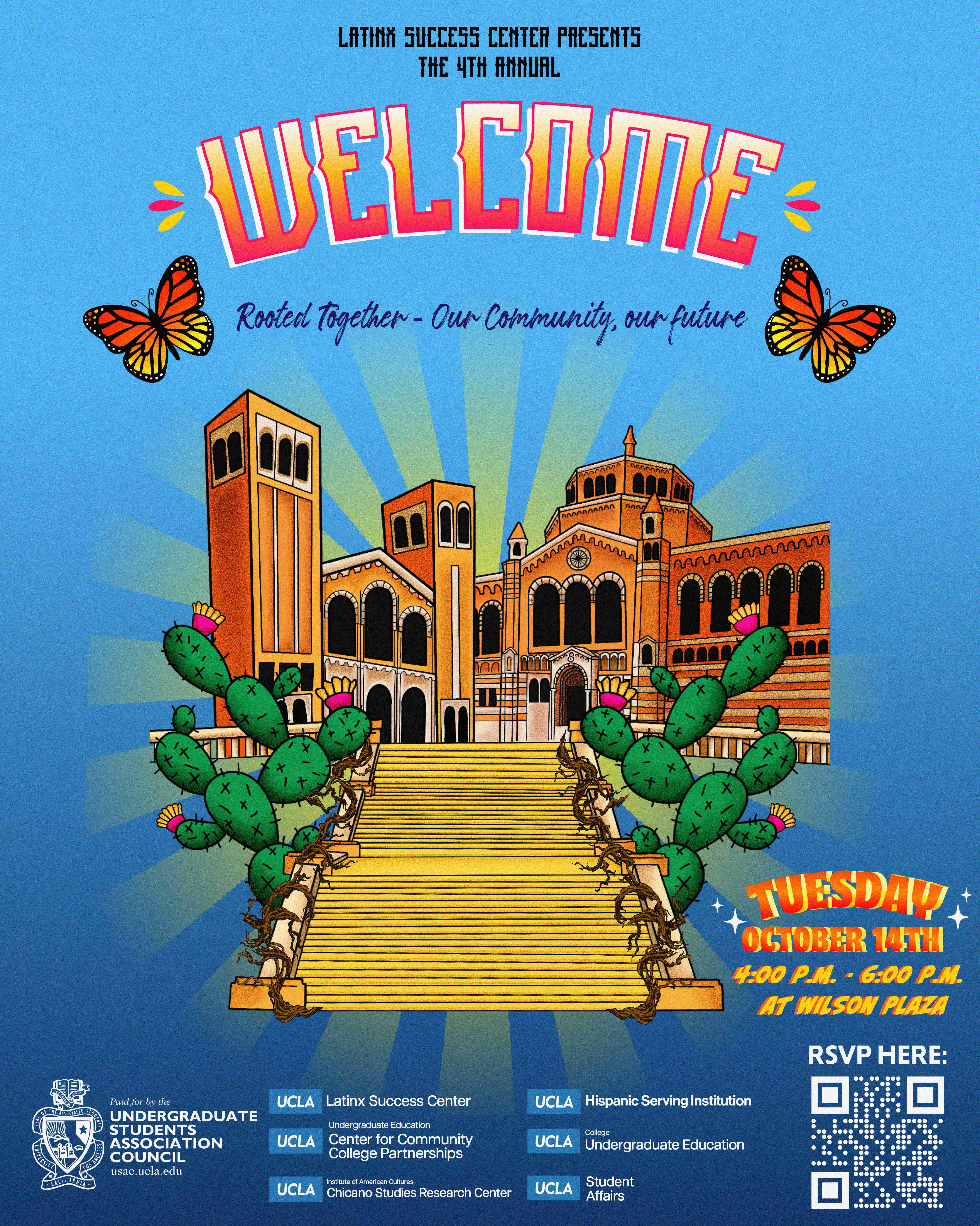 Join us for an afternoon filled with community, connection, and celebration as we give a warm bienvenida (welcome) to campus. Enjoy a live performance by Afro Latinx Connection, music by DJ Olea, a campus resource fair, and remarks from UCLA leadership, plus food and refreshments. This celebration is free and open to all!