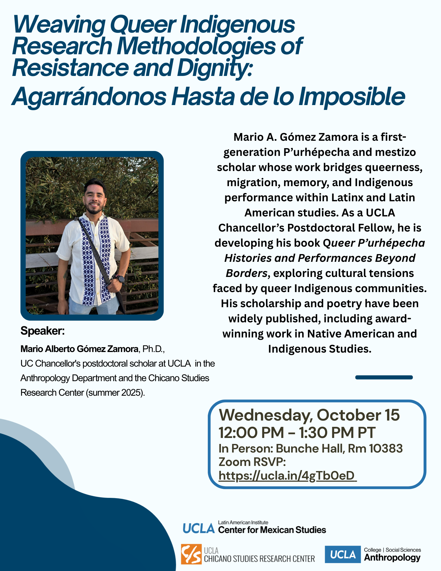 Mario A. Gómez Zamora, PhD, is a first-generation P’urhépecha and mestizo scholar whose work bridges queerness, migrations, memory, and Indigenous performance within Latinx and Latina American studies.
