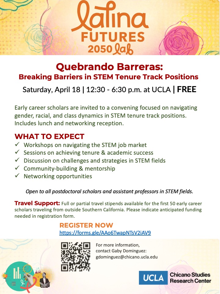 The Latina Futures 2050 Lab at the UCLA Chicano Studies Research Center invites early career scholars to a free, one-day convening focused on navigating gender, racial, and class dynamics in STEM tenure track positions. Includes lunch and networking reception! Registration required.